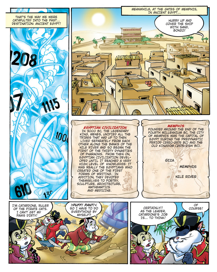 The popular children’s story appears in graphic novel form for the first time in the U.S., with stories never seen in America. This time, Geronimo Stilton and friends must travel back in time to Ancient Egypt! The Pirate cats, jealous that the face of a man was placed on the body of the Sphinx, are determined to coerce the Pharaoh into changing the face of this monument. It’s up to Geronimo and co. to travel back in time and stop the Pirate Cats before it’s too late. Check out Geronimo Stilton Graphic Novel #2 "The Secret of the Sphinx" in stores now! Can't wait? Then take a look at these preview pages from the book!